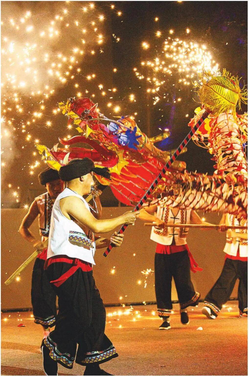 表演环节同样独具特色。“扫瘟巡游”时,龙队沿村镇行进,舞龙人挥动龙身,完成翻滚、喷水、沉海底、跳跃等动作。龙身时而呈S形翻滚,时而左斜舞出、右斜推进,或绕圈盘旋,寓意扫除街巷瘟瘴之气。高潮在于“烧瘟”:点燃花筒与蓝烟,朝龙珠、龙体及舞龙人喷射火花。舞龙人顶着漫天星火,高举龙节棒完成“火龙戏珠”“火龙漫游”“龙头钻节”等十余种高难度动作。现场星火如瀑,在夜色中划出赤色光流,蓝烟缭绕其间,视觉震撼强烈,更寓意“越烧越发,越烧越旺”。